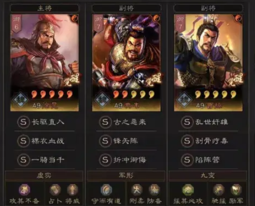 队伍的徐晃方面也非常独特,陷阵营的急救效果十分契合这队。同时还有折冲御侮和典韦的保护,以及曹操时不时的刮骨疗毒,给足了主将徐晃生存空间以及输出环境。