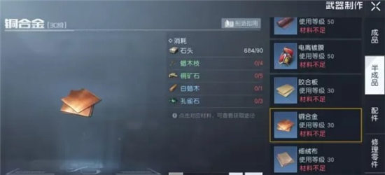 2、孔雀石与铜矿石可以与其他二级材料组合制作铜合金与细绒布等半成品,而各类半成品则是打造30—40级装备的必备素材。
