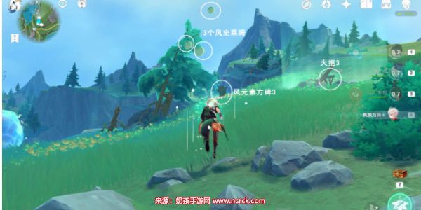 2、接着往地图的北方向走,射击树顶3个风史莱姆,激活风元素方碑3,点燃火把3;