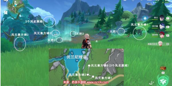 1、进入游戏首先传送优兰尼娅湖南方向锚点,往地图的东北方向走,激活风元素方碑1-2,点燃火把1-2;