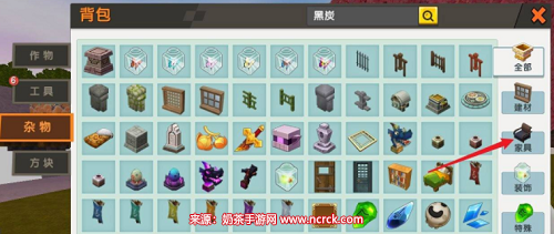 2、点击杂物菜单里面的家具按钮,查看所有家具。