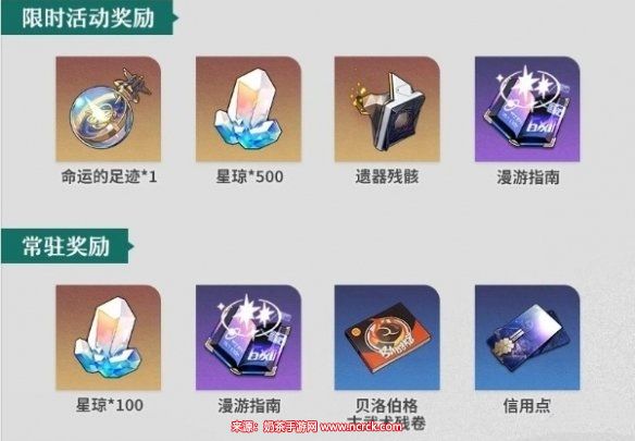 3、活动奖励有命运的足迹*1、星琼*600、遗器残骸、漫游指南、贝洛伯格古武术残卷。