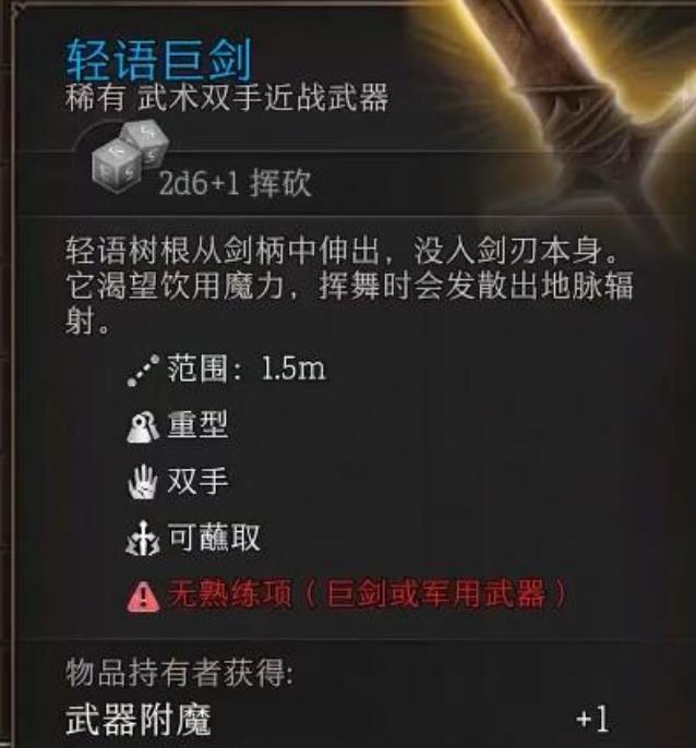 3、轻语巨剑:2d6 1挥砍,双手近战巨剑,对敌人造成伤害时为目标附加沉默状态,无法使用有声组件施法。