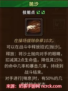3、 释放:将沙土抛向对手的眼睛,扣减其2点生命值,降低其15%的命中几率和暴击几率,持续到战斗结束。
