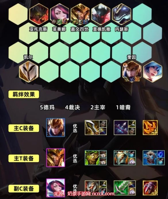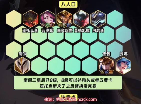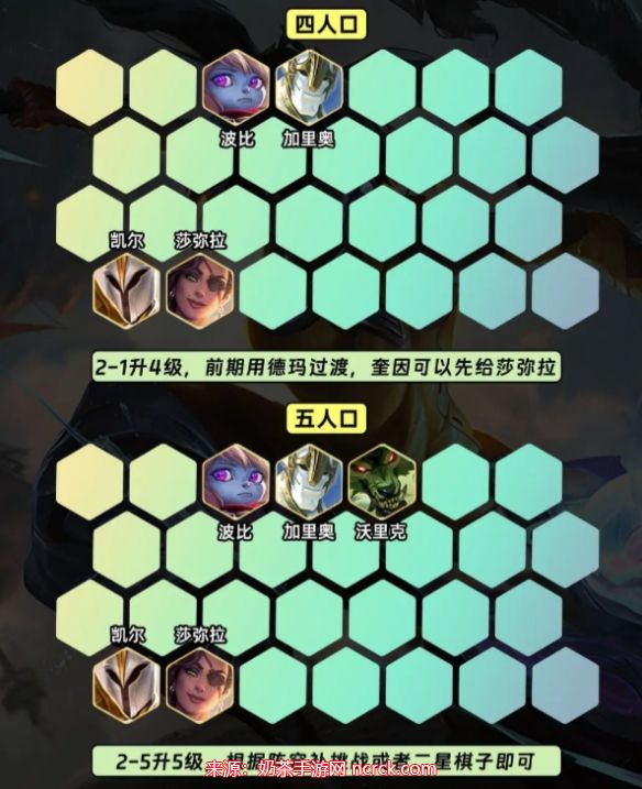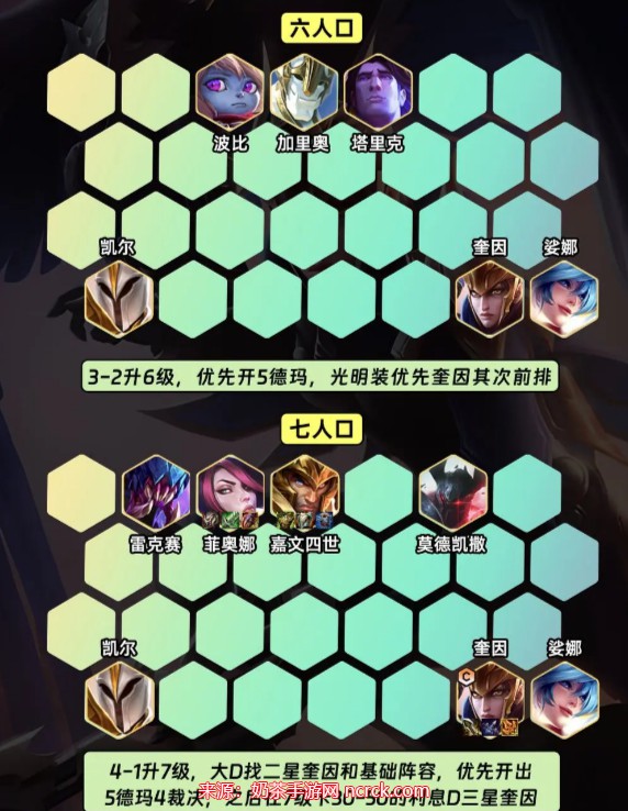 后期(4-1及之后):在4-1升至7级,此时主要寻找二星奎因和其他核心单位,优先选择5德玛4裁决。随后在7级稳定利息在30-50之间,寻求三星奎因。完成后升至8级,补充狗头或其他强力五费卡,如有剑魔则可替换雷克赛。