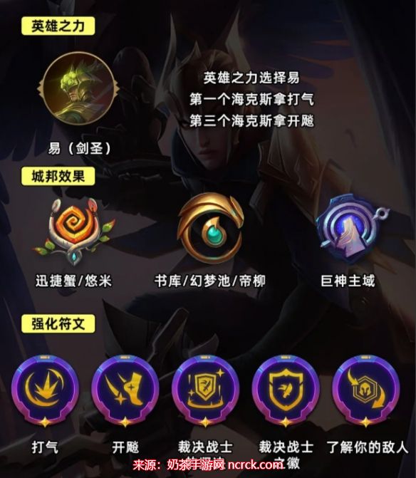 易(剑圣):易作为队伍中的助攻英雄,其打气、开飚技能可以为奎因提供更好的输出环境。