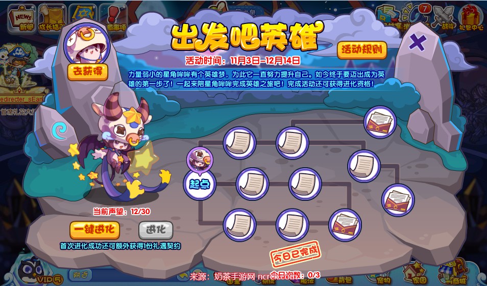 星角哞哞渴望成为真正的英雄,需要小洛克们一同踏上这段英雄之旅。每日玩家有三次出行机会,但这三次机会并不是以移动格子数计算,而是有可能遭遇不同的随机事件,如战斗、委托任务等。