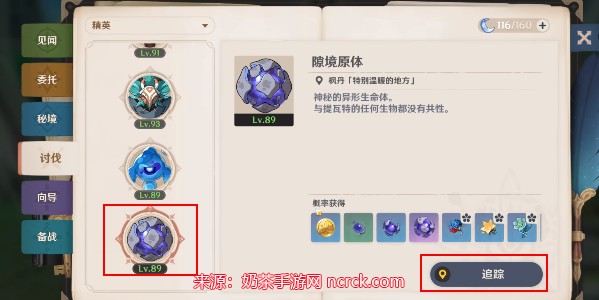 1、小伙伴们首先打开冒险之征,在讨伐中的众多怪物中找到隙境原体并且追踪这个怪物;