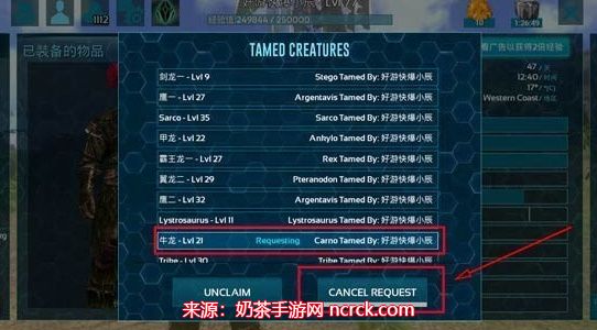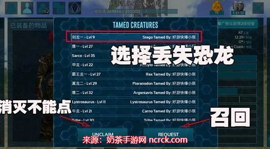 3、如果丢失的龙没有死亡,可以选中丢失的恐龙,点击下方的Request(召回)。