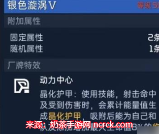 银色旋涡的厂牌特效为动力中心。当玩家使用技能、射击命中或自身受到伤害时,都会将累计能量值生成为晶化护甲。这个护甲能够为自己和队友增加临时护盾,虽然护盾并不算特别厚,但能够提高生存能力。这种特效在战斗中能够提供额外的保护,让玩家更加持久地作战。