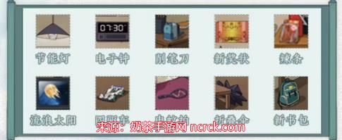 奖状、辣条、流浪太阳、电子钟、电蚊拍、折叠伞、削笔刀、书包、玩具车、节能灯