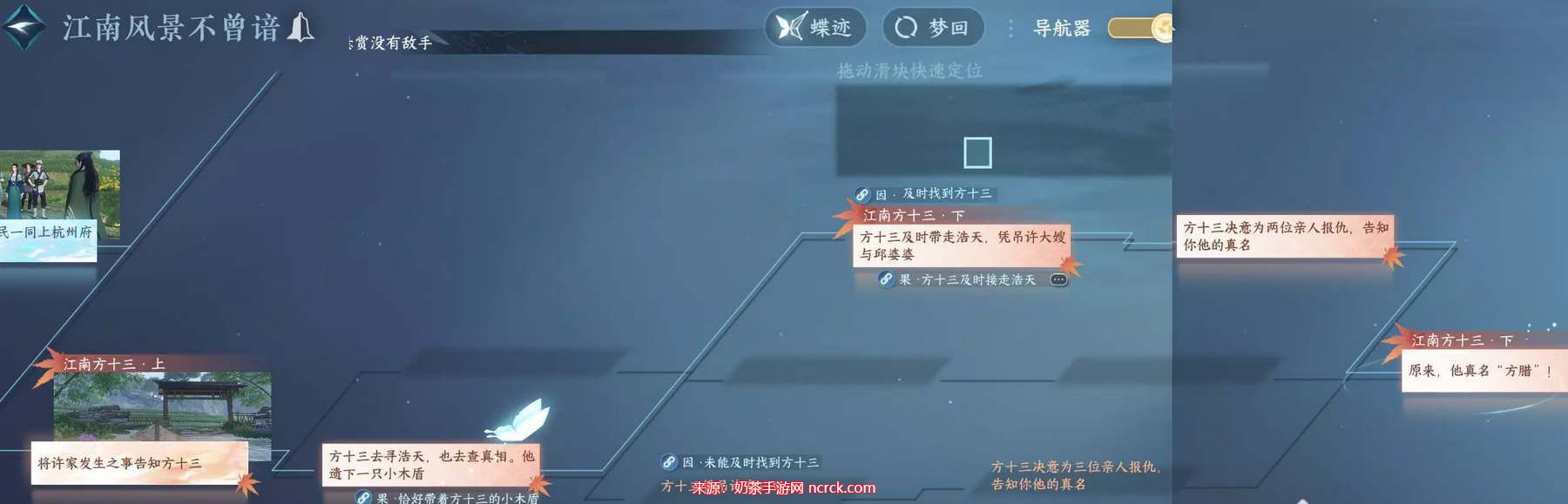1、前置要求:江南主线梦回到【门第之殇】与浩天对话“文武可兼得”“十三叔是谁”,获得磨喝乐以及人间传闻江南方腊。