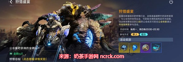 在参加活动之前,玩家们一定要先去公会餐吧用餐,以获得全体buff。用餐时人数越多,每次狩猎盛宴活动中伤害加深效果也就越好。具体规则是,周一参加狩猎盛宴的状态由上周五至本周一所有享用参人数来决定,周四的状态则由周二至周四享用人数决定。因此即使不参与活动,也要呼吁所有玩家都来享受公会餐吧,这样也可以间接提供帮助。