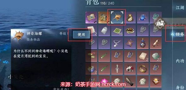 3、最后打开背包-任务中使用“神奇海螺”道具,之后继续进行对话就可以完成任务了。