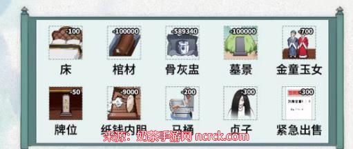 通关答案:床、棺材、骨灰盅、墓景、金童玉女、牌位、纸钱内胆、马桶、贞子、紧急出售